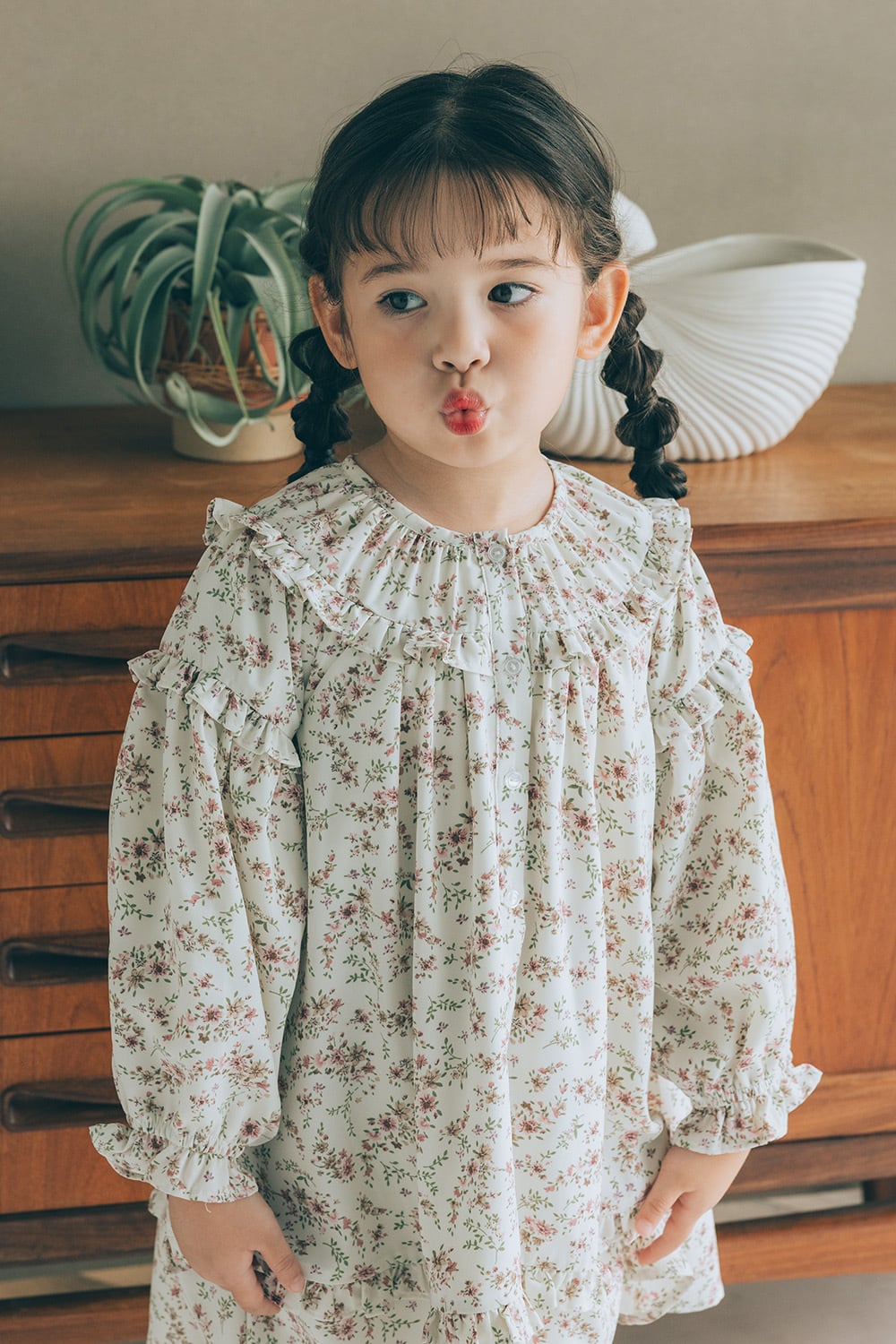 肩、袖、裾にバランスよくあしらわれたフリルがポイント。