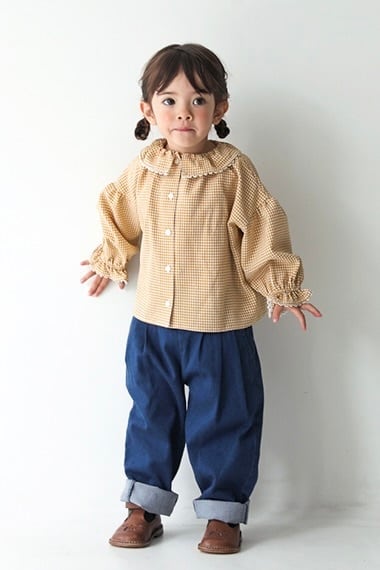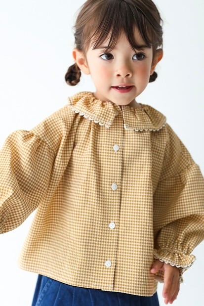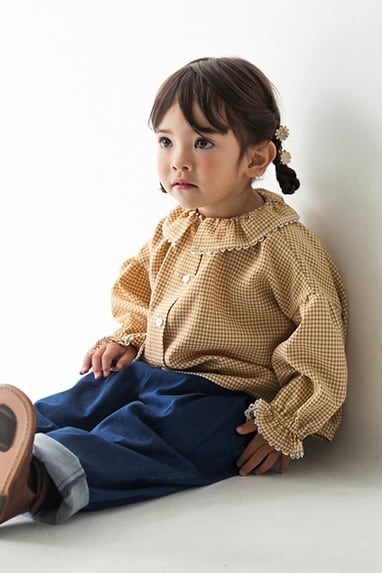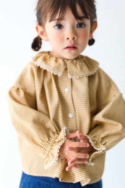 レース付ラッフルカラーブラウス<Yellow check>