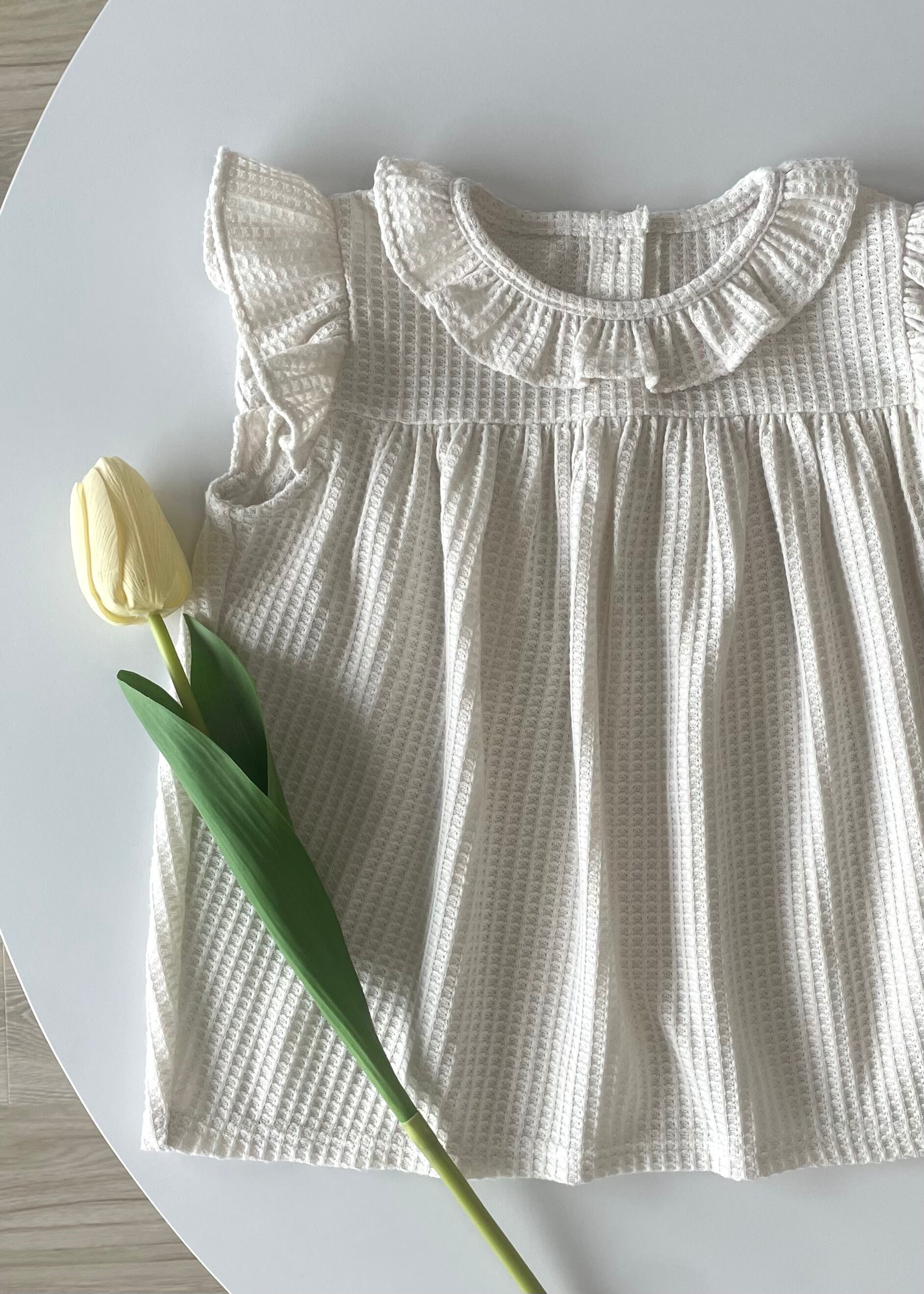 アイボリーはポコポコとしたさり気ない編み地が可愛いカットソー素材で、柔らかな風合いで着心地がいいのも◎
