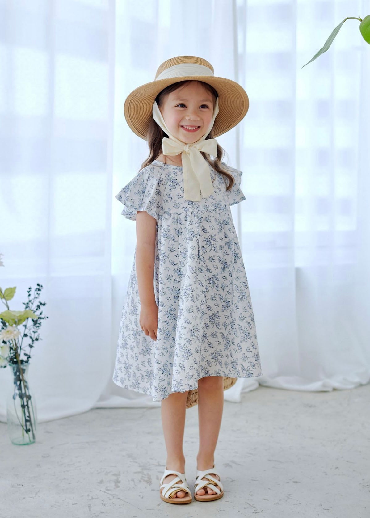 涼しげな白地にブルーの花柄に女の子らしいデザインで、暑い夏のお出かけに着ていただきたい1枚♪